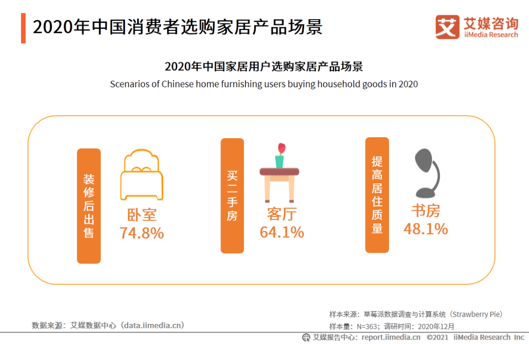 調查顯示,2020年,中國家居用戶選購家居產品場景分布中,“裝修后出售”為臥室購買家居產品的占比最高,為74.8%;裝修原因為“買二手房”中,為客廳購買家居產品的占比最高,為64.1%;為“提高居住質量”而為書房購買家居產品在各場景中占比最高,為48.1%。臥室作為人們進行睡眠放松的場所,勢必成為家居用戶“裝修后出售”而購買家居產品的首選。