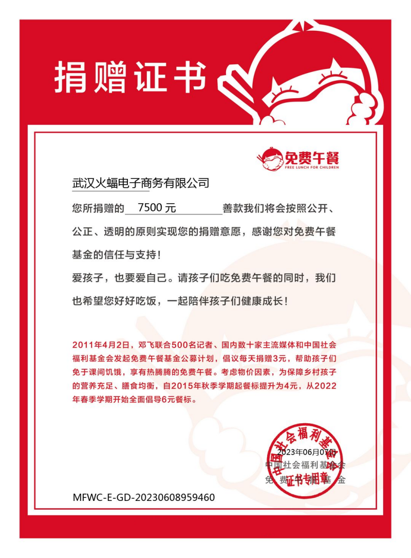 在全體成員的愛心支持下,火蝠電商共籌集了7500元愛心基金,此筆基金也將全部用于貧困山區小孩的午餐中,讓愛傳遞到他們的每一個角度,讓他們不用再餓著肚子去探索知識的殿堂,讓他們有機會去見識外面廣闊的天地。每個人的力量或許微小,當我們所有人的力量聚合起來,我們改變的將是整個世界,這也正印證了“火蝠公益基金會”的初心。