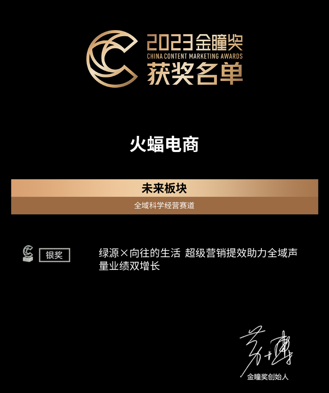 9月23日,2023金瞳獎(jiǎng)?lì)C獎(jiǎng)典禮在北京圓滿落幕。會(huì)上,知名綜合電商服務(wù)商,武漢火蝠電子商務(wù)有限公司(以下簡(jiǎn)稱“火蝠電商”)創(chuàng)意作品《綠源×向往的生活 超級(jí)營(yíng)銷提效助力全域聲量業(yè)績(jī)雙增長(zhǎng)》成功斬獲2023金瞳獎(jiǎng)-未來(lái)板塊-全域科學(xué)經(jīng)營(yíng)賽道【最具數(shù)智經(jīng)營(yíng)力品牌——銀獎(jiǎng)】,此舉不僅獲得行業(yè)高度關(guān)注,更再次證明了火蝠電商的綜合運(yùn)營(yíng)服務(wù)能力。