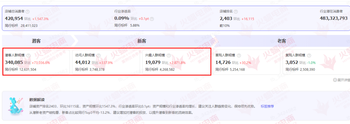及時(shí)處理退款售后,加快物流和發(fā)貨攬收速度,提升店鋪DSR評(píng)分。針對(duì)用戶消費(fèi)情緒,火蝠電商更是做好了店鋪用戶體驗(yàn)管理舉措,及時(shí)做好安撫,適當(dāng)折扣讓利,減少差評(píng)和“問大家”板塊等負(fù)面內(nèi)容的影響。截至十月下旬,品牌店鋪潛/新客資產(chǎn)結(jié)構(gòu)得到明顯優(yōu)化。潛客人群規(guī)模超過34萬,店鋪總消費(fèi)人次超過42萬。