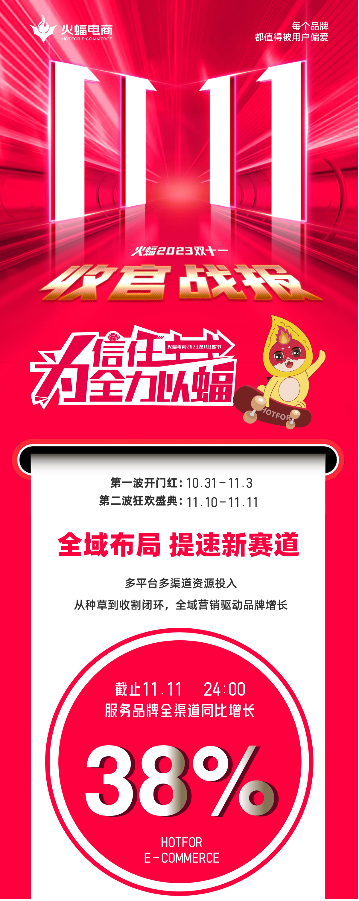 歷經近一個多月的備戰與爆發,截止11月11日,火蝠電商2023雙十一已經圓滿收官。在一次次“大考”中,向品牌方和社會各界交出滿意答卷,不斷加固自身在行業中的競爭地位。
