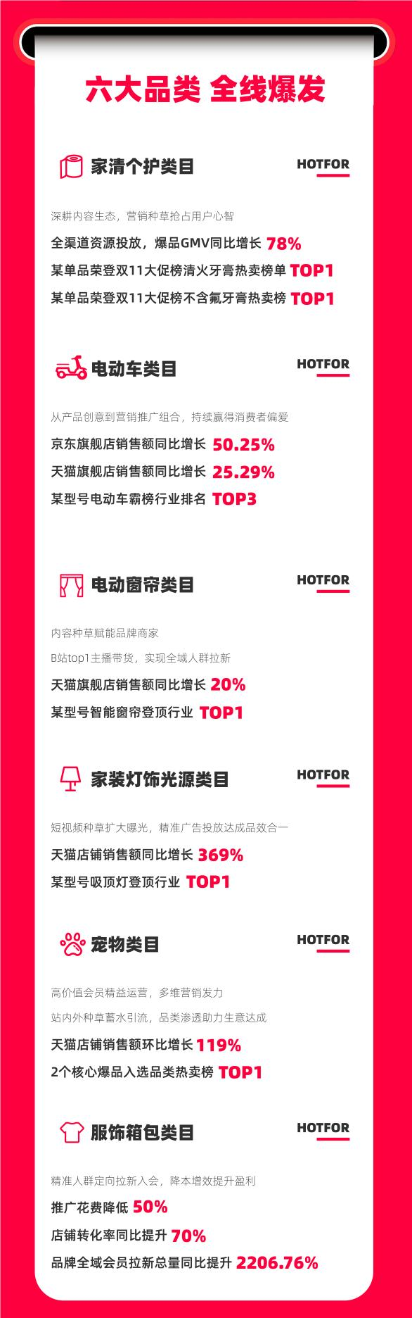 根據戰報數據顯示,在運營平臺方面,以小紅書、B站為代表的“新賽道”提速明顯,充分發揮著平臺“種草”能力;以天貓/淘寶、京東、拼多多、貓超為代表“傳統賽道”依然保持優勢。火蝠電商服務品牌各平臺的核心數據,同比去年雙十一期間,均保持較好增長態勢。