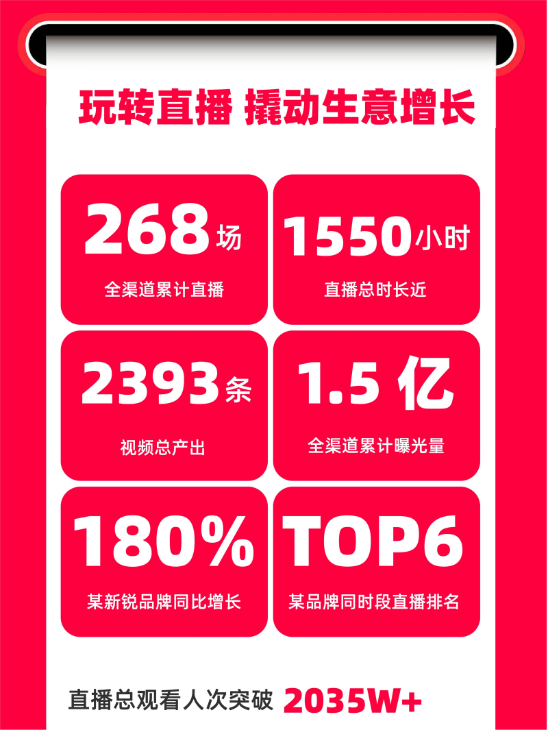 內容營銷方面,憑借高效資源整合、溝通場景的精準打造和創意內容匹配。本次雙十一,火蝠電商在“直播”和“短視頻”上持續發力,全網累計曝光量超1.5億,全渠道累計直播場次達268場,直播觀看人數超2035萬,視頻總產出量、品牌全渠道曝光等方面數據表現突出。