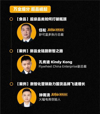 具體而言,在“萬店連鎖·零售復興”維度,面對電商換擋期,如何洞察消費趨勢?如何打爆細分賽道超級單品?億邦動力總裁賈鵬雷、火蝠電商CEO鐘雨清等人將發表演講。圍繞數智化營銷助力國貨品牌飛速增長、超級品類如何打破瓶頸、新品全鏈路數智之路等熱點話題,共同探尋新零售下各品類的崛起之路。