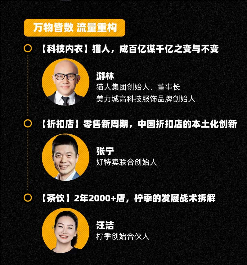 在“萬店連鎖·零售復興”維度,面向零售新時代,如何打破品牌增長瓶頸?紅杉中國合伙人蘇凱將帶來年度思考。同時,a1零食研究所創始人兼CEO周煒平、一知合伙人&首席運營官陳樂、白小T創始人張勇和三只羊集團CEO杜剛等人,則通過零食、AI、服裝、直播等行業賽道分享零售復興之路。